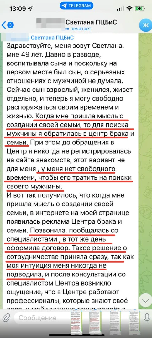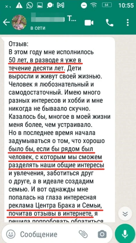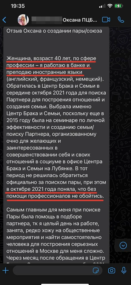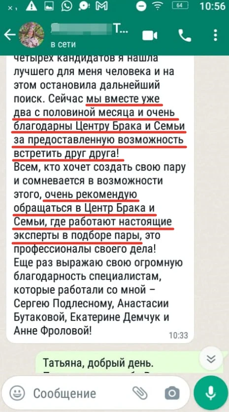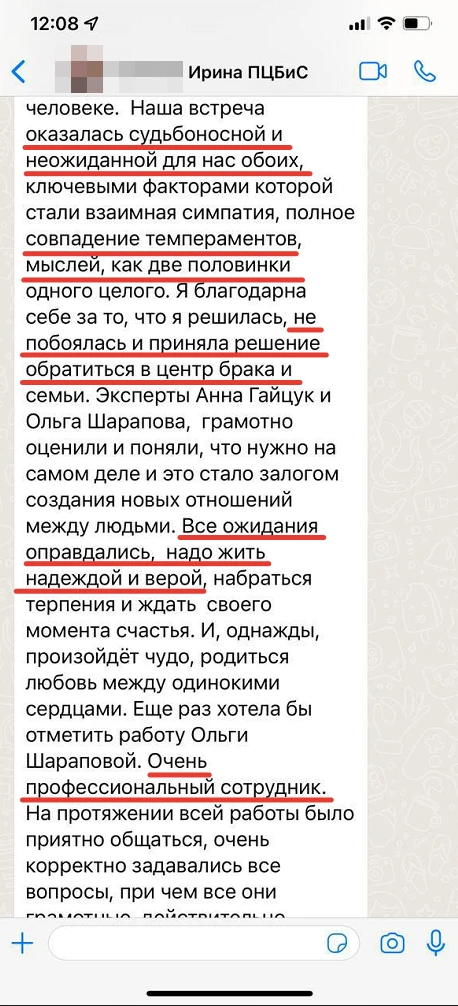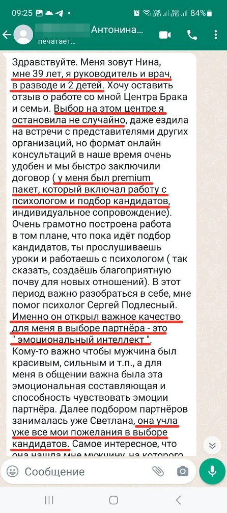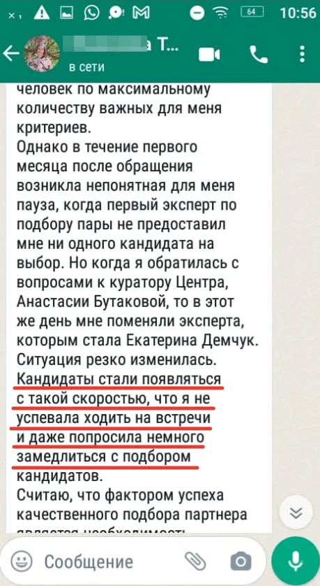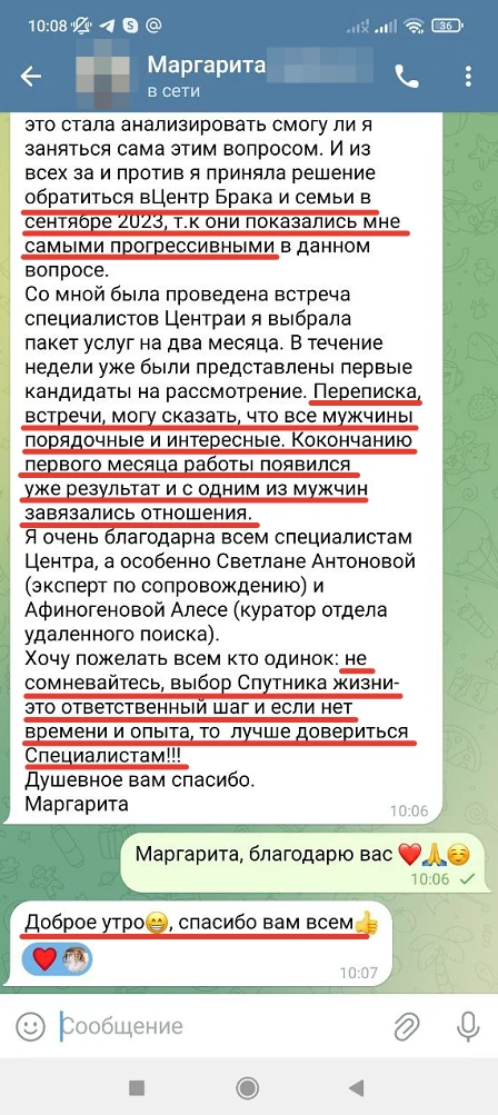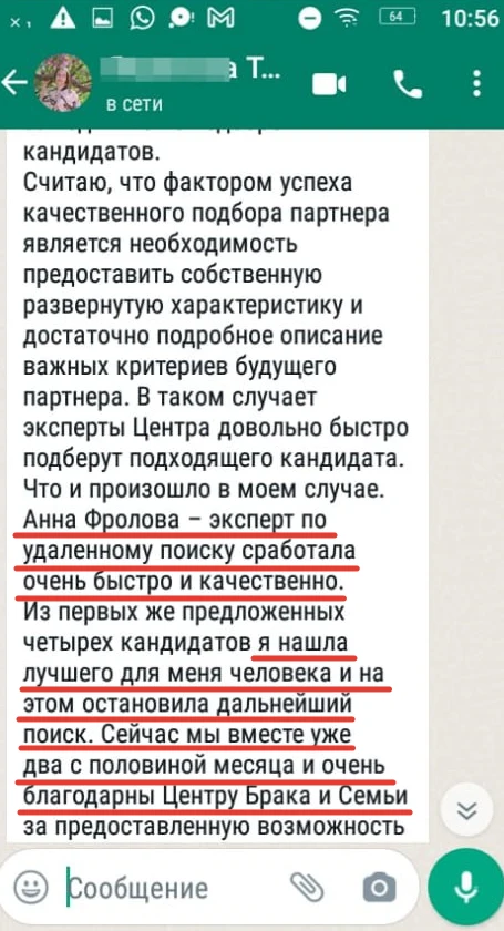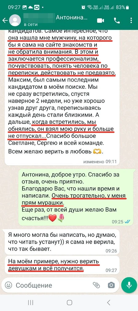 Мы не просто направляем Вам анкетные данные человека с фотографией, мы его презентуем, направляя Вам только проверенную информация, раскрывая потенциал кандидата, особенности, его сильные и яркие черты характера, и таким же филигранным способом мы находим точки соприкосновения с Вами и Вашими предпочтениями, чертами характера, интересами, взглядами!